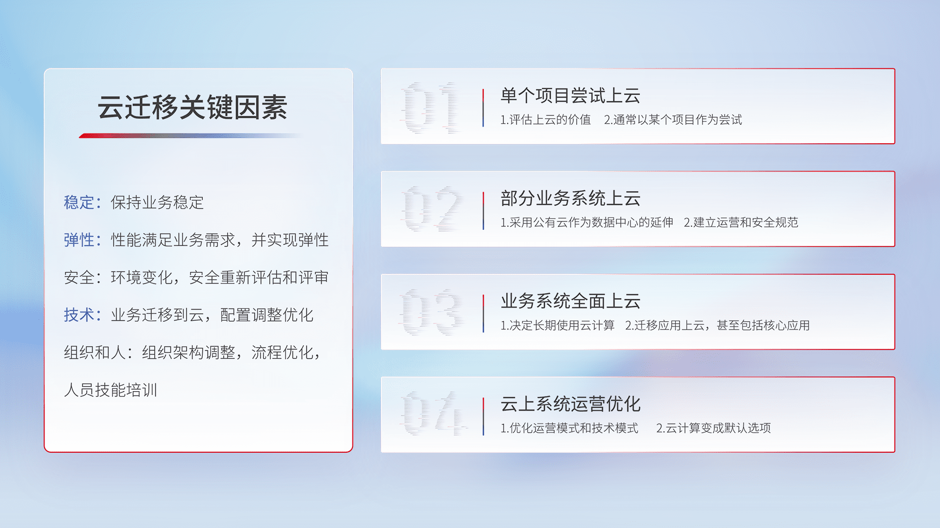 结合实际业务,,从规划设计、、、云平台选型、、、云原生改造、、数据迁移、、、集成交付,,,,迁移全过程为客户识别最佳上云路径,,,做好风险识别管理,,,设计网络架构、、、身份权限、、、安全审计合规、、、、操作审计、、、日志审计、、、监控告警策略、、、多站点容灾设计等,,对云上基础设施进行整体规划,,,提升IT治理水平,,,,以满足弹性、、、、高可用、、、高性能的需求。。