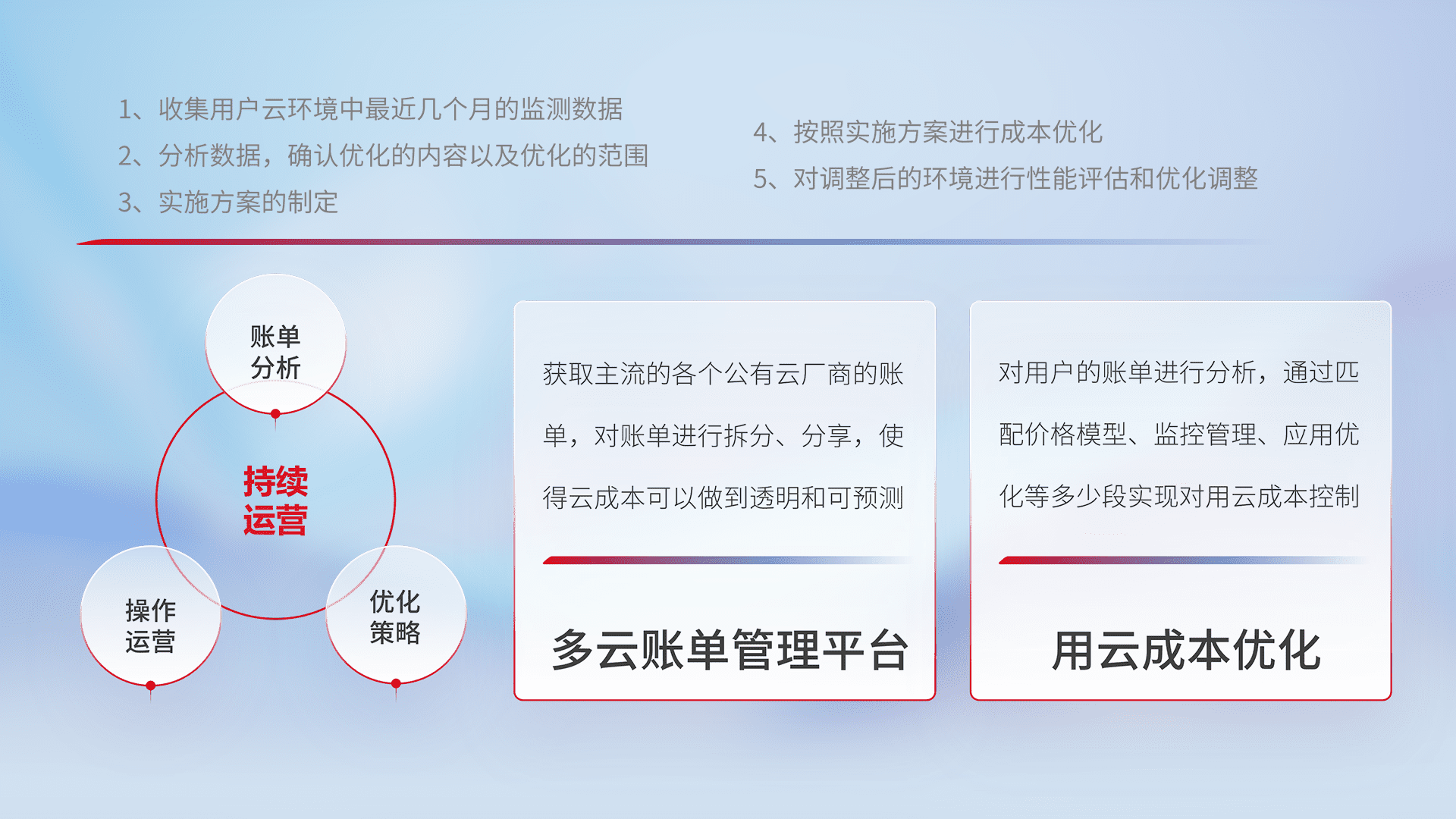 通过多云纳管,,,,以统一的资源数据模型把客户的云资源进行抽象和封装,,进而实现对多云资源的统一操作,,保障云资源管理的可靠性、、稳定性与可用性。。。量身定制化运维内容,,,配置、、、、开发运维、、补丁管理、、、、备份、、、监控、、、认证和访问管理、、、、审计和日常巡检等,,,保障在用云过程中的可靠度,,稳定度以及高可用率。。